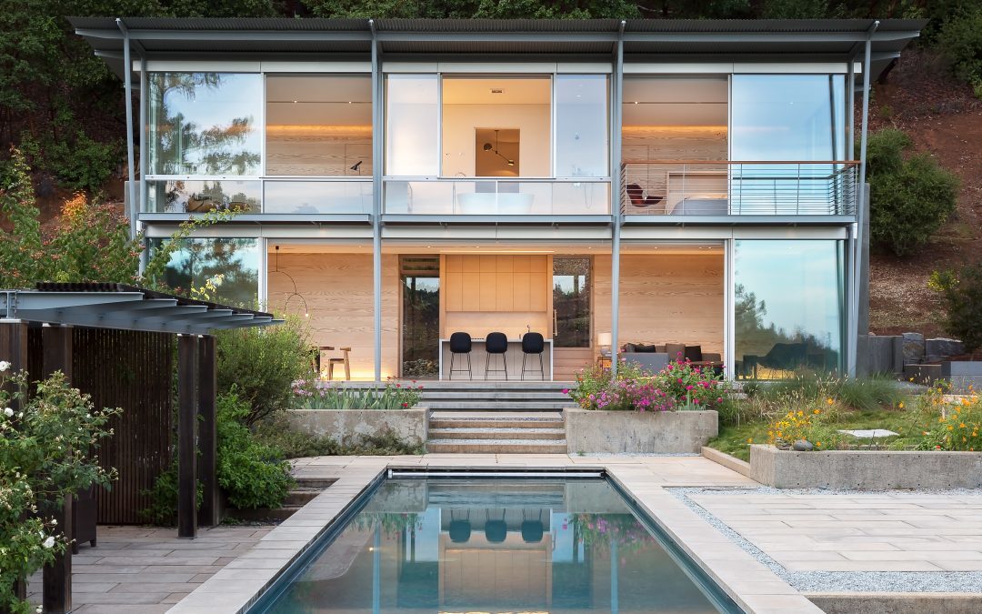 Conceived as a garden pavilion complementing an existing contemporary guest house, Sunrise was designed to respond to its rugged, remote, and beautiful surroundings. The clients, a newly retired couple, have used the property and guest house as a weekend retreat for years. Admirers of these architects’ work, they were interested in creating a sleek, modern cabin in the hills above the Sonoma Wine Country. The main structure spans 191 square metres with an added cabana of almost 13 square metres.