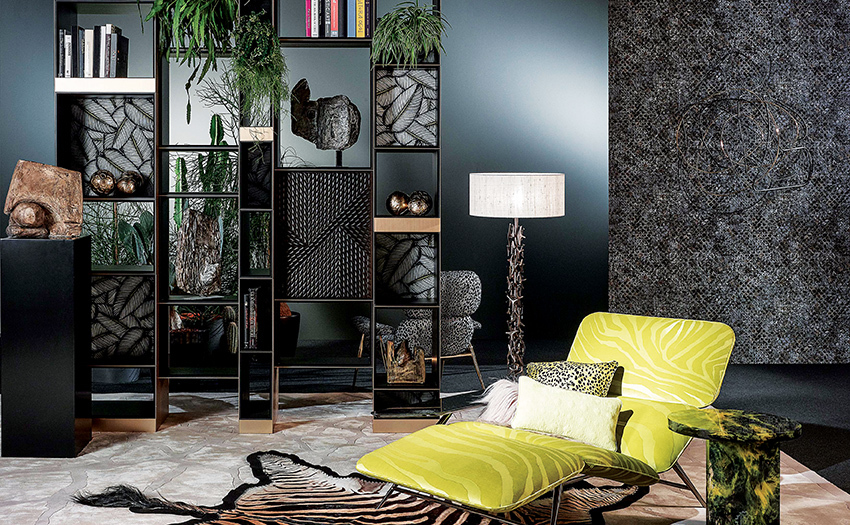 In celebrating a joyful lifestyle, a flamboyant jungle inspiration took centre stage in the furniture collection, produced and distributed by furniture specialist JC Passion. Classic tones were combined with the season’s signature vibrant citron green hue. Exotic patterns included a banana leaf motif, combined with the new lynx and zebra prints. Natural elements such as Monstera leaves became the metallic decorative additives embellishing lamps, coffee tables and dressers. Plexiglas was crafted for dining, coffee and console tables, mixing transparencies with citron green and smocked shades, as well as abstract decorations; lacquered leather was used for accessories.