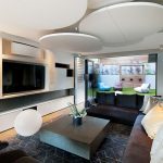 - The joinery was designed by the interior architects to reflect the linearity of the horizon while being innovative in using new materials, such as the circular acoustic panels suspended from the ceiling of the TV area