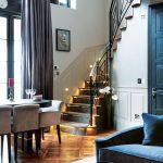 - A decorative wrought iron banister of delicate dimensions frames the stairs. The rich and distinctive parquet flooring creates a sense of space over the two adjoining floors.