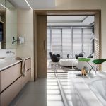 - In the main suite the large mirror wall reflects the sea views and features a small tea / coffee prep space, desk and work area, plus full height linen cupboard with cedar shelves for storage. Sanitaryware by Flush Bathrooms.