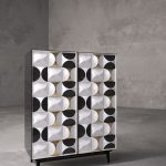 The cabinet has been designed for insertion in an exclusive setting. The inlaid doors with glossy finishes, and the combination of different materials like marble and brass, reproduce the effect of silk in both visual and tactile terms, bringing fluidity and movement to the retro geometric design, and adding lustre to the whole, suggesting a sense of timeless perfection.