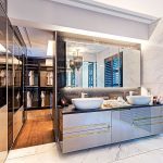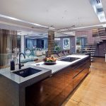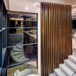 The sensual curve of the staircase, spiralling up and over the water below, effortlessly draws attention to the principal living level, which opens up to the kitchen, dining room, formal lounge, study and family room. The outdoor entertainment area manifests as a seamless extension to the open-plan living space and is positioned strategically under the dramatic projection of the seven-metre cantilever of the master bedroom above.
