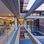 Entering the home on the lower floor, the visitor is met with an interior rain feature. Here, the water collects in a large internal / external water feature that forms the base of an elegant sculptural staircase.