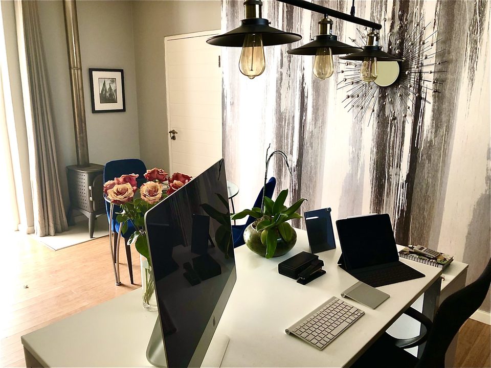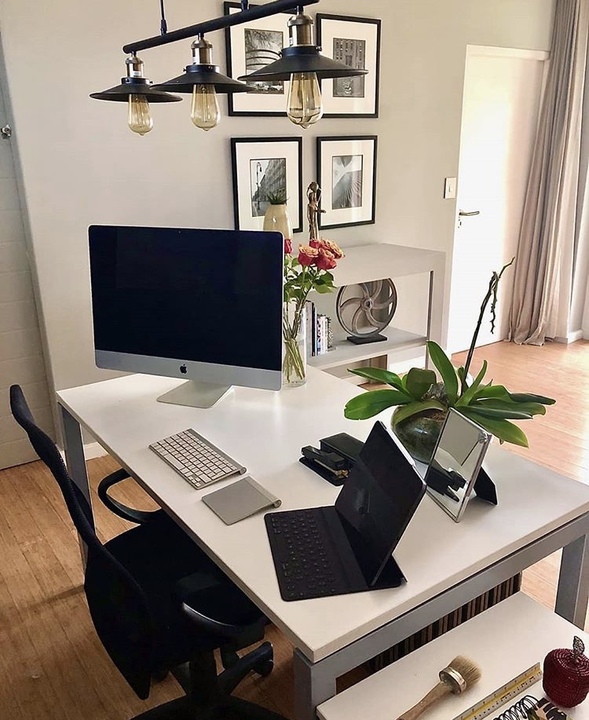 traditional black light fitting over the desk allows for a bright space that will not cast a shadow on