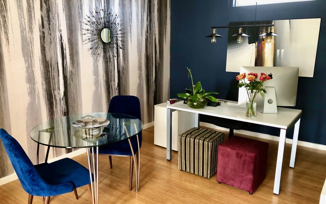The wall behind her desk is an elegant Classic Blue and features this notable piece of art. A