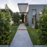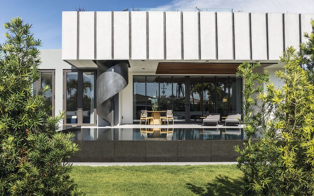 A sequence of courtyards interrelates each of the spaces from front to rear, creating a straight path that flows from the entrance towards the boat dock via a single corridor connecting all the areas. It extends from the entry courtyards with green walls, to cantilever pergolas and an interior sculpture courtyard, to the main vaulted ceiling living area, which opens up to an infinity pool and sculptural staircase leading to a roof deck.