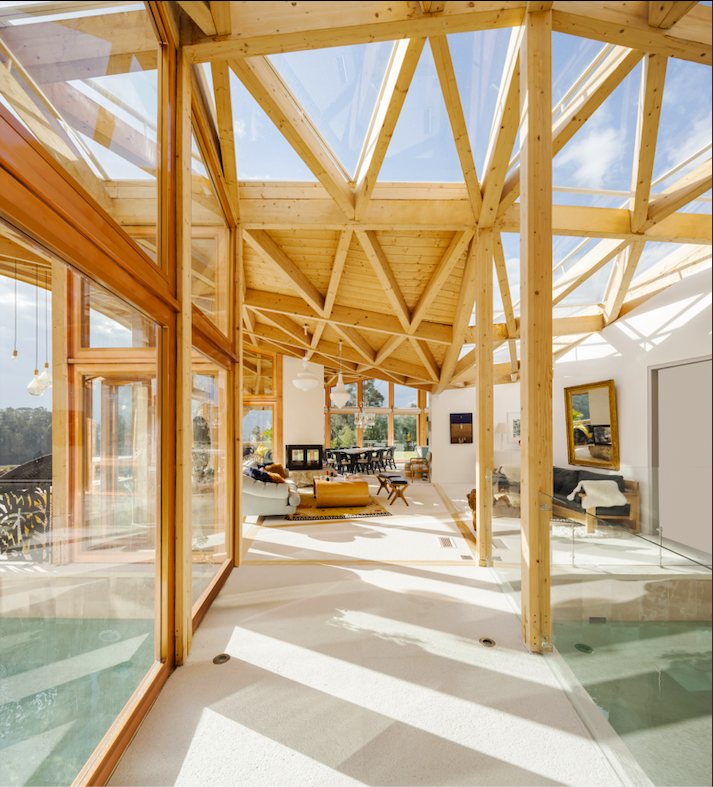 The rest of the interior floors are of white micro stone and inlayed eucalyptus.