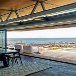 The living / kitchen / entrance area opens up to the entry courtyard on one side, featuring a stunning, custom painted mural wall by Vajrakaymen, and to the pool deck and the expanse of the ocean on the other; there are spectacular views of the mountains from every part of the home. A library / study with timber panelling, reclaimed from the floor of an old 1720 farmhouse, adjoins another of the bedrooms.