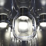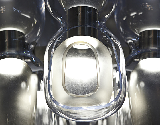 Informed by Hadid’s renowned design language, the fluid composition accentuates the varied clear and opaque elements of the chandelier. Suspended at varying heights, the glass bodies create an impressive play of light and shadow; their sculptural forms, notable in daylight, generate different qualities in the evening when illuminated.