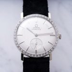 The 33 mm timepiece houses a manually-wound OMEGA calibre 510, and features 44 brilliant cut diamonds surrounding the bezel, as well as an elegant silvered ivory dial with a small-seconds subdial.
