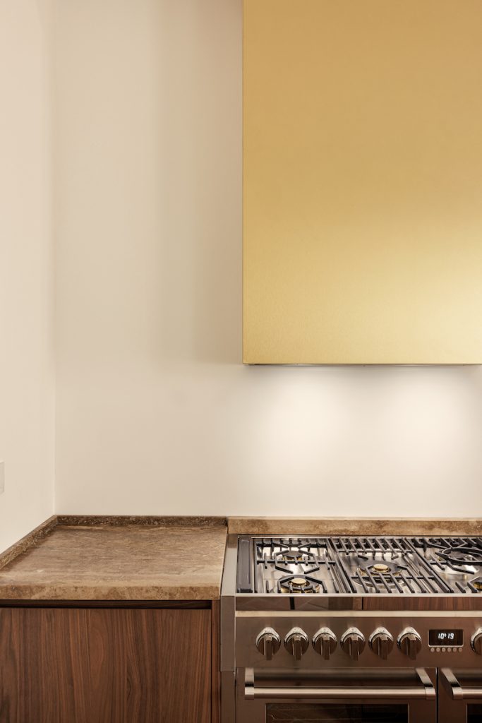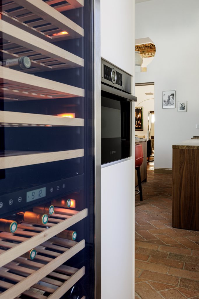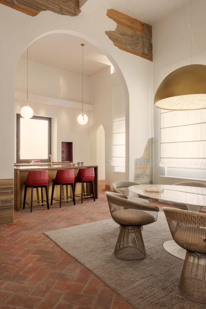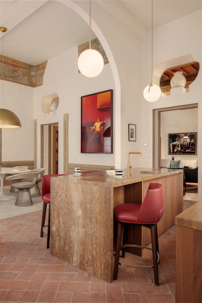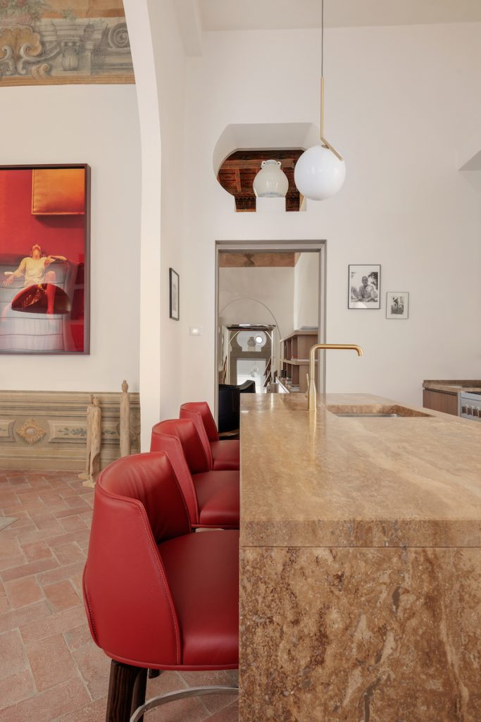 The dining area is lit by the golden Skygarden hanging lamp, by Marcel Wanders for Flos, a brand also represented by the two black IC Lights, by Cypriot designer Michael Anastassiades in the kitchen area, produced by Elmar in wood and brass to a design by the architects, with a walnut travertine top made by a local craftsman in warm Mediterranean earthy tones, enhanced by the red of the Archibald stools by Poltrona Frau.