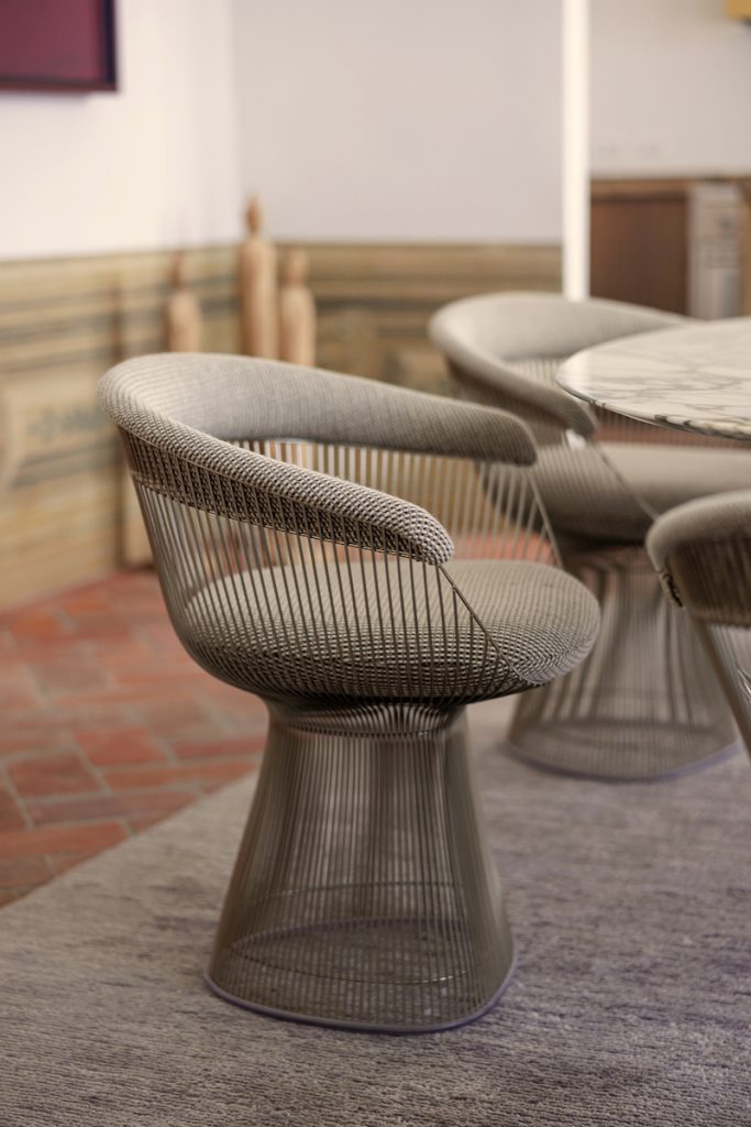 This home has a large living area, featuring a living room connected to the kitchen and dining room, and a more secluded sleeping area. The two openings of the living room lead into the dining room with an open kitchen. The room reflects a sophisticated style and a sense of composure, and is furnished with iconic design pieces such as the oval, marble-topped Tulip dining table by Eero Sarinen, surrounded by comfortable seating such as Warren Platner’s Platners chair, both manufactured by Knoll.