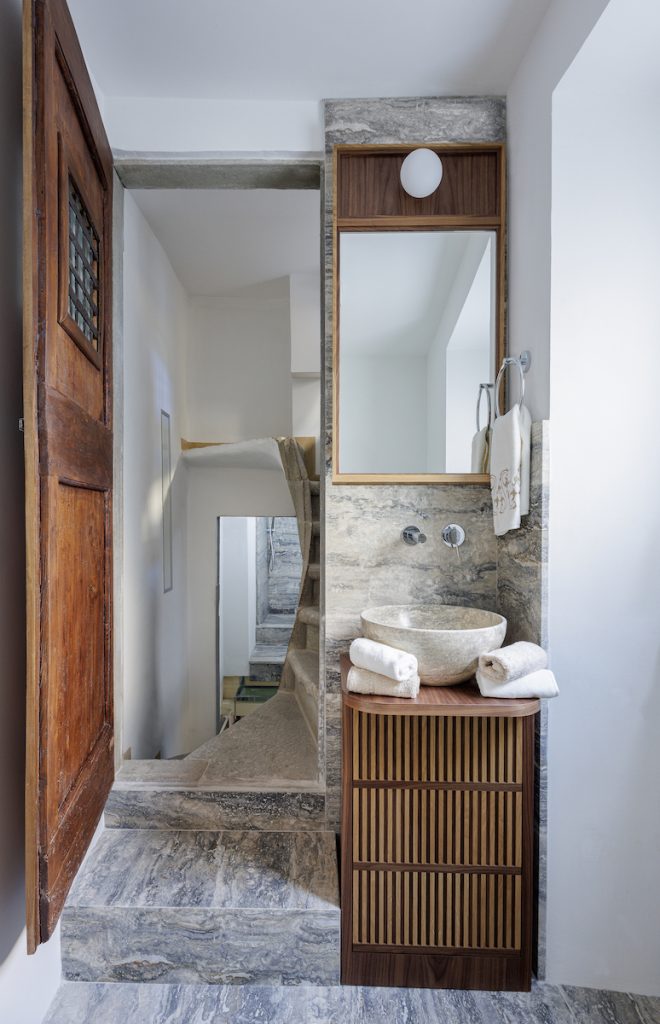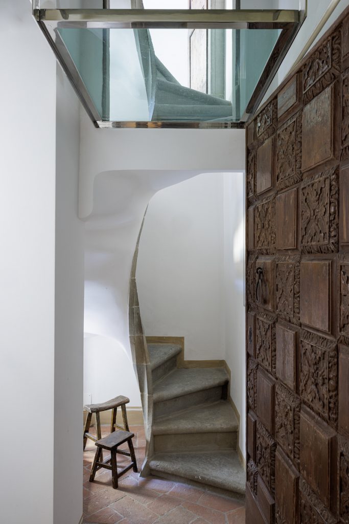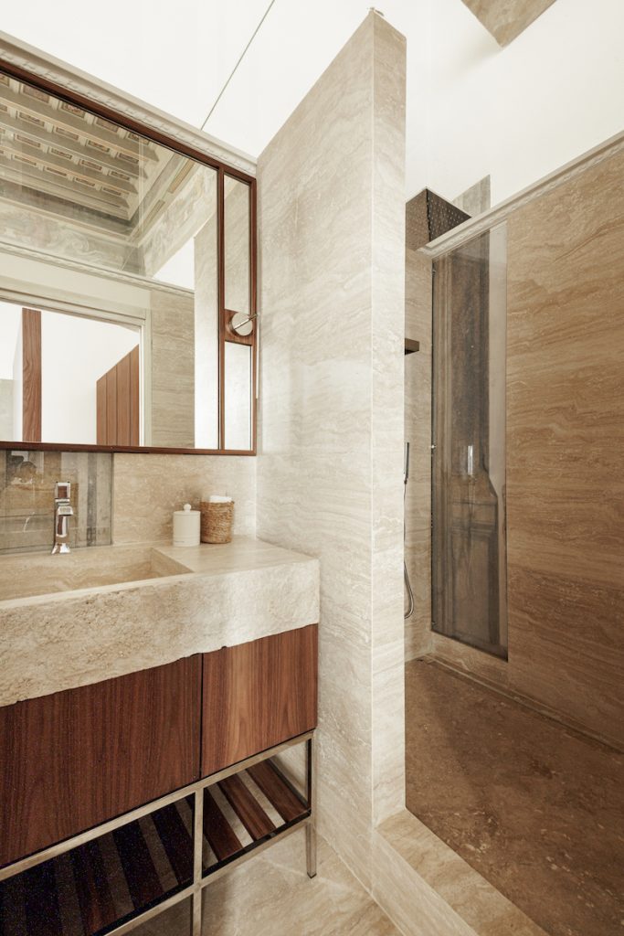 The characterising element of both the master, and guest bedrooms, is the Canaletto walnut headboard designed by Pierattelli Architecture, which in both separates the sleeping area from a wardrobe space with functional chest for drawers. The apartment is rounded out by a study and two bathrooms that feature different types of travertine: classic for the master bathroom and moonlight blue for the guest bathroom, which was completely renovated by the architects. A Turkish bath can be found on the second floor accessed via a spiral staircase in pietra serena – an original element of the apartment. Throughout the house, the original floor in Tuscan terracotta – one of the oldest and most traditional materials – has been preserved and its reddish hues lend an earthy sense of warmth to the rooms with the fine art photography by Frenchman Hervé Saint Hélier.