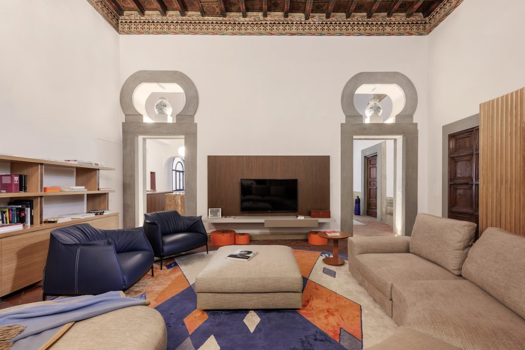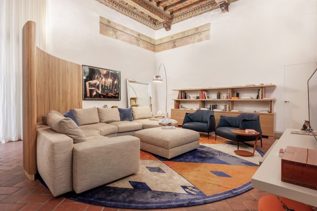 Bold colours, tailor-made solutions, natural materials and designer pieces define the light-filled spacious interiors where the neutral hues of the walls contrast with the nuances of the painted ceilings. Important artwork such as the coffered ceilings and frescoes add value to the entire house and testify to its long history. These are the ingredients for a restyling that intends to preserve the charm of the location and its ancient Italian history, brought back to life in the present.