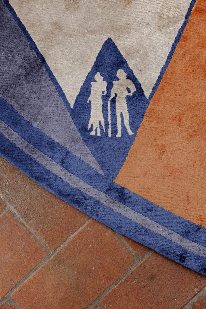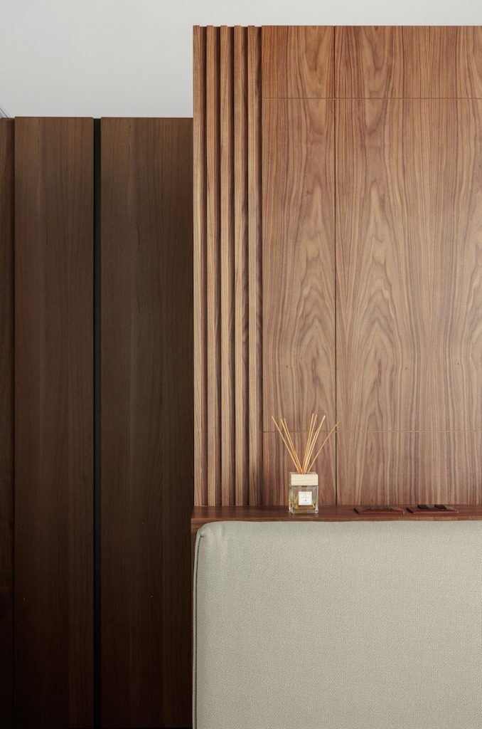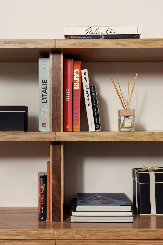 The entrance hall, created ex novo during the restyling, was defined by the architects through ribbed oak, an effect that makes the piece even more unique. This curved line then continues throughout the living area thanks to the choice of furniture such as the semi-circular modular sofa in Venise beige, designed by Gabriele & Oscar Buratti for Lema, in dialogue with the soft lines of the two Archibald armchairs, designed by Frenchman Jean Marie Massaud for Poltrona Frau. The bookcase was designed by the architects and handcrafted in Canaletto walnut and honey oak, while the suspended TV cabinet is by Lema. To give a sense of warmth and embrace the various elements present, the architects designed a circular rug that was made in Pakistan with big visual impact, which also links the various colours on display from the shades of blue to orange and light beiges.
