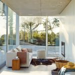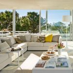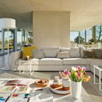 The pure lines and modern architecture of this villa, set among the wind-blown hills of Portugal, blend seamlessly with the surrounding countryside. The spacious, light-filled living room opens onto the swimming pool and was furnished with a composition of the Magnum sofa, in an elegant ecru color fabric, studded with contrasting bright yellow cushions. Placed in a niche, in front of the fireplace, creating a relaxing oasis perfect for conversation or reading, is another composition of the Magnum sofa, this one upholstered in an elegant cream color fabric.