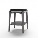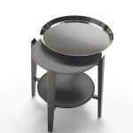 A family of small functional tables made with great attention to detail, with a slender wooden structure and a metal top in the form of a tray. Available in two round sizes, where the smaller one has two shelves and one particular feature: on the upper level, the elegant metal tray can be easily removed from the legs that hold it in place, to become a handy serving tray.