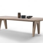 The range of wooden tables has been expanded. The particular double leg in fine wood, with its overturned V shape, becomes an important formal feature: full and solid, with rounded corners, it gives the silhouette of the large rectangular table, in two sizes, a special modern, noble appearance. The solid wood top extends over the central legs, making it possible to comfortably seat up to ten guests around the table.