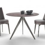 A large collection of dining tables and smaller tables are driven by the theme of lightness. The slim central leg is made of metal. The dining tables are round, oval, square and rectangular, in various sizes for a wide range of spatial needs: from the small round bistro table that is also ideal for use in public venues, restaurants and cafes, all the way to the large family dining table for ten to twelve persons. The tops are available in solid wood or with a lacquer finish, or marble.