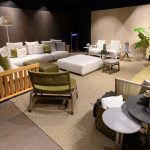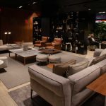 The company’s Design Center curated the new installation, which faithfully reflects that of the corporate showroom in Meda, Italy. All of the materials utilized, from the porphyry walls to the brilliant green that frames the Outdoor collection, create an exhibit space imbued with understated elegance, beyond the bounds of time and trends, that is synonymous with the Flexform style.