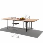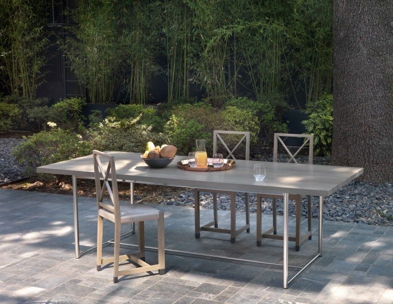 A dining table distinguished by a deliberately uncomplicated design and an intriguing contrast of materials. The austerity of the austenitic stainless steel 316 base stands out against the textural beauty of the slatted solid iroko top, available with natural finish, stained grey or lacquered white finish. The stainless-steel base is epoxy powder-coated in white, khaki green, wine red or with a burnished finish.