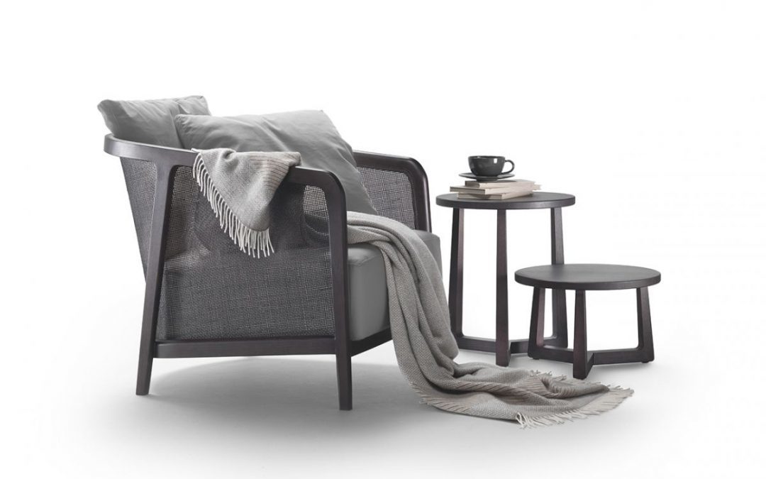 The Tosca armchair by Antonio Citterio has a Neo-Colonial spirit. The totally visible wooden structure of the back, like an exoskeleton, is a statement in itself. With discreet proportions, for combination with the many sofas in the catalogue, this armchair has a sturdy seat cushion wrapped by an enveloping back in woven cane. The frame is available in solid wood Canaletto walnut, Canaletto walnut extra, Canaletto walnut stained coffee or in ashwood natural, stained teak, stained ebony, stained wenge, stained cherry, stained walnut, stained coffee or stained brown – with reed (natural). The seat is in wood and metal with foam polyurethane padding, covered with protective fabric lining). The backrest cushion is filled with down, with upcharge upholstery removable fabric or leather covers.