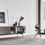 Especially fascinating is the contrast between the lightness of the smoked glass compartments and the textured surface of the cooked oak. The Jeremy cabinets are also available in glossy lacquer finish in three colours: white, dove grey or black; and rest on elegant cast aluminium feet with burnished or satin finish.