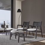 The Ortigia family includes an armchair with armrests, an armchair without armrests that can be paired with a footstool and also with dining chairs.