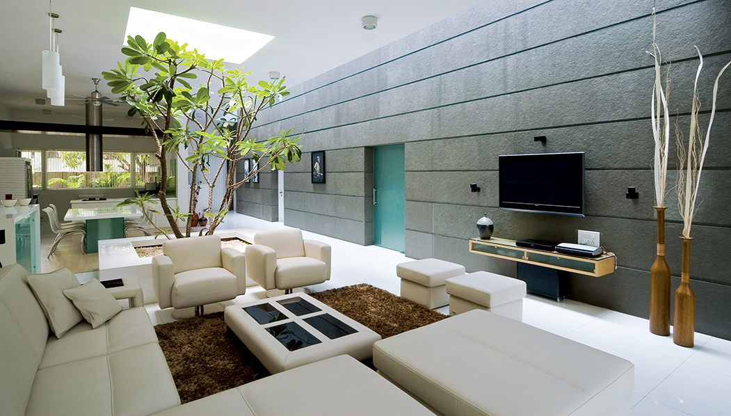 Says architect Sunil Patil: ‘The wall is conceived as the vertical surface panel for the exhibition of their paintings. It is well lit by natural light through the provision of effective skylights for this purpose. In addition, the wall creates excellent interaction between the spaces on both sides through well considered openings. The interior spaces flow to the exterior and garden through various access points from the living, dining and bedroom areas. The intention here was to perfectly blend the architecture, interior decoration and landscape – in synch to complement each other – rather than have any one of these standing out as a dominant factor.