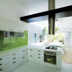 - The kitchen platform and the dining table are finished with solid surface material to create a homogenous effect.