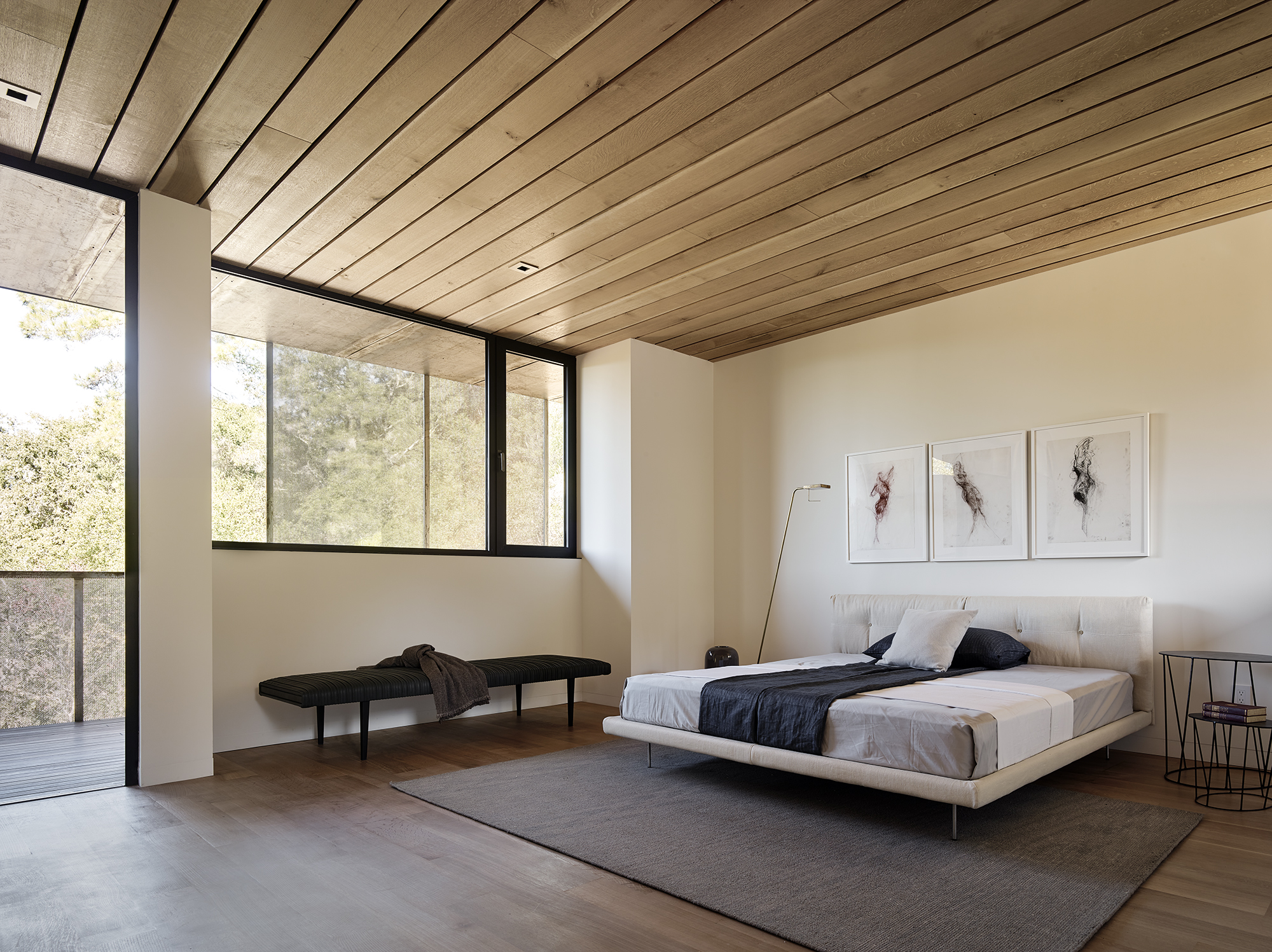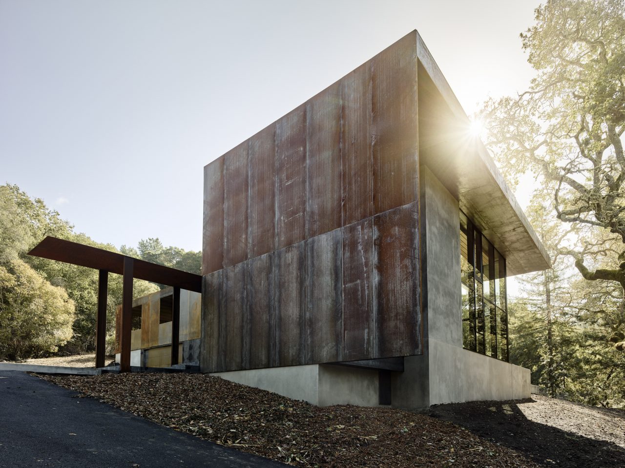 A three-bedroom program began as a remodel of a 1954 ranch house at the foot of a hill next to a seasonal creek. After finding the existing structure and soils to be unsuitable, the direction settled on reusing the existing footprint under the shade of a Valley Oak that had grown up close to the original house. The surviving portion of the original house is the fireplace which was wrapped in concrete and utilised for structural support. This made additional grading unnecessary and allowed the new house to maintain the same intimate relation to the old oak.
