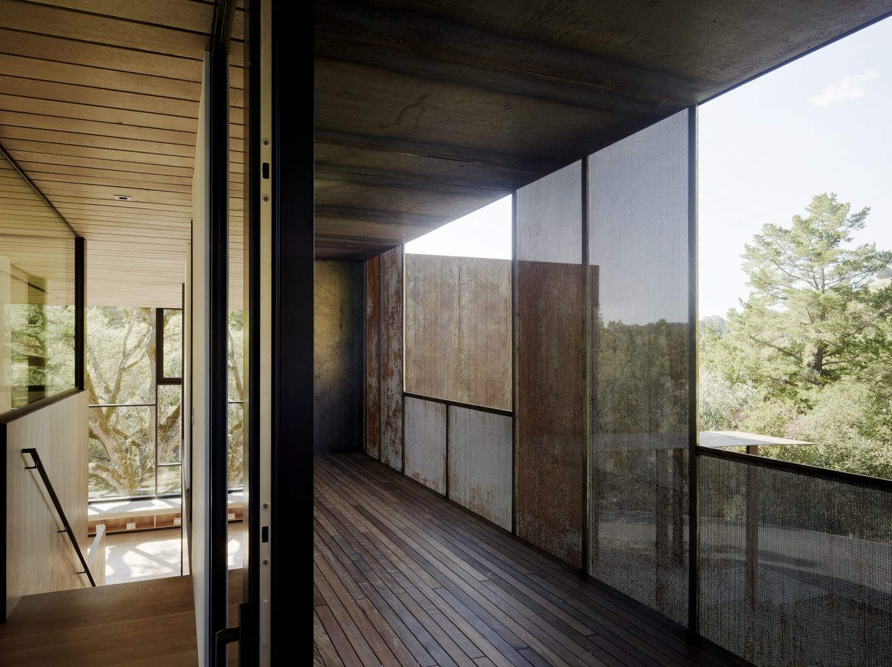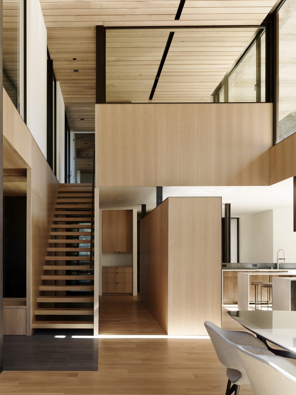 Entry to the 346-square-metre house is from the north, where a steel plate covered walkway leads to the front door. The interior is light-filled with 7-metre ceilings and floor-to-ceiling high performance glazing, which builds continuity with the landscape. A 3.6-metre wide retractable glass wall opens onto a patio and adjoining garden. The family desired an open living layout that connected directly to the landscape. A mezzanine plan evolved with a double height family space nested with a master bedroom and study stacked above the kitchen and nook. A screened pacing deck for long phone calls shades the upper level from afternoon summer sun. Downstairs, secondary bedrooms along an extendable hallway, wrap an outdoor dining area situated between the kitchen and family room.