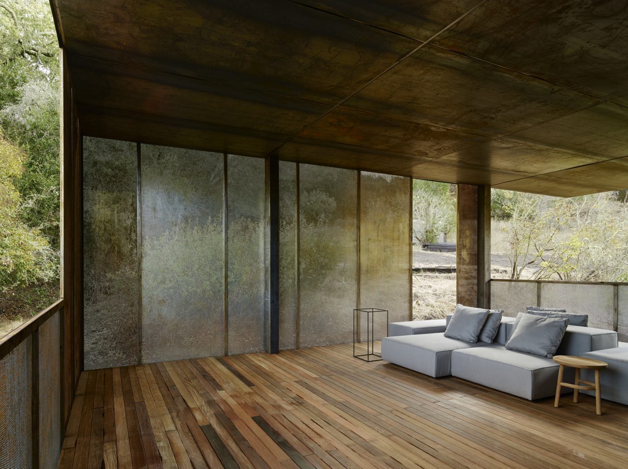 A 14-gauge Corten rain screen provides a no-maintenance skin. High levels of insulation and glazing efficiency reduce heating and cooling loads. An 8.1kW photovoltaic system provides on-site renewable energy and produced more electrical energy than the house used the first year. Rainwater is collected via a waterfall from the roof at the end of the hallway. Buried tanks store water for use in toilets and laundry. Greywater is collected separately and reused for irrigation. Electronically commutated motors and variable speed heat pumps are used to further limit energy use and control heating and cooling. An energy recovery ventilator is used to provide fresh air.