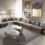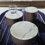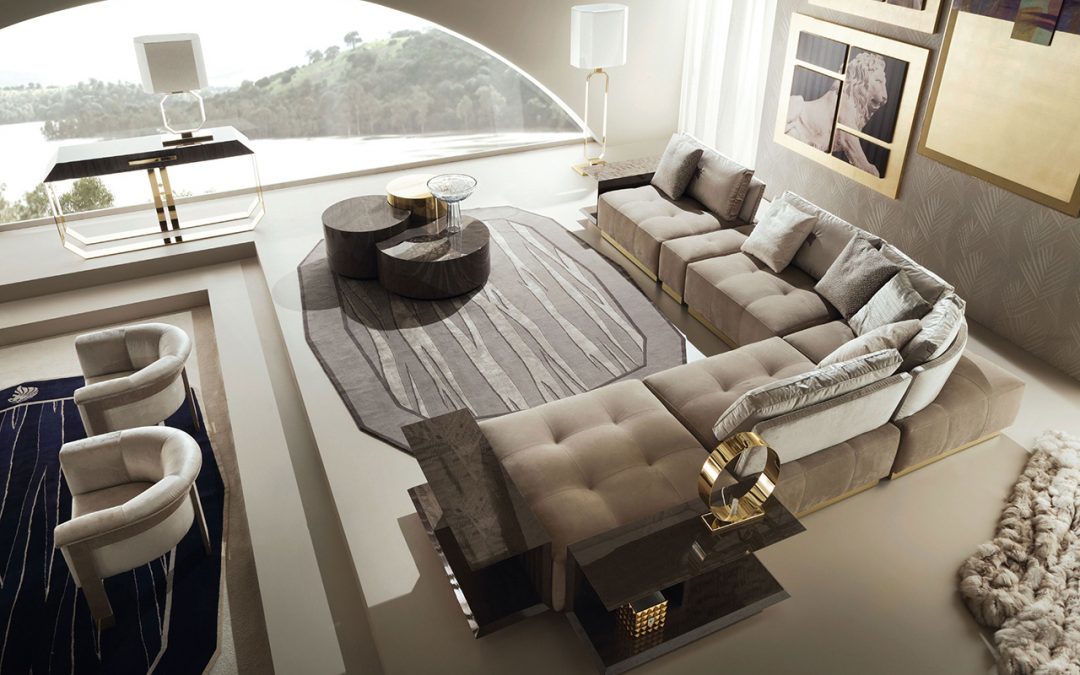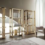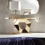 The dining area contains the round Infinity table – featuring a Lazy Susan –, which captures your attention above all due to the peculiarity of its light gold sculptural base, a polyhedron whose faces become a source of light and reflective surface, making the whole structure dynamic. The highlight of the whole collection is a true work of art: the console table with a mirror characterized by an innovative twist and an interpretation of Art Déco with a clean design and forms created from the careful study and processing of solid prisms capable of unexpected effects that amaze the observer.