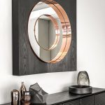 The PORT (Portal) mirror is reminiscent of ripples on water. Two layers of glass are stepped back from each other and ringed by polished copper bands, the depth of which is reflected, and exaggerated in their reflection. As with ripples on water, the stepped glass gently distorts the reflection. The circular mirrors are recessed into a steeply bevelled oak surround, further enhancing the sense of depth.