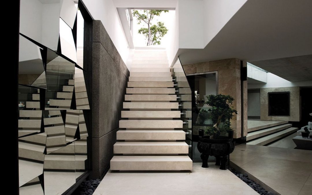 The title of BLACK RAIN derives from the image of a winter’s rain where torrents of rainfall at an angle driven by harsh winds; grey tinted mirror conjures dramatic wintry days. The panes of mirror are raked and angular, their reflection distorted by the varying surface levels.