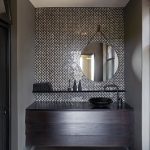 The bathroom has a contemporary design with black sanitaryware and dark wood, a zigzag vanity, and a round mirror hung on a leather strap by Dark Horse.