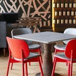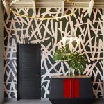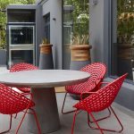 The front patio of the building is accented by red Zulu Mama chairs designed by Haldane Martin surrounding a round concrete table from Weylandts. Frameless glass entrance doors are flanked by Wiid Design’s Soma planters by Indigenus.