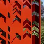 This was turned on its head by painting the building exterior charcoal (instead of white) and adding traditional slate stone cladding, as well as red sliding screens inspired by the geometric patterns painted onto mud huts in West Africa. This counterbalances the South African colonial tradition with a much more current African aesthetic, with a prominent red contrast against the green vineyards. This postmodern approach aimed to make the building more inclusive through its symbolic use of other cultural signs.
