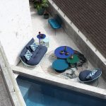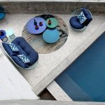 Relax poolside in Hula Lounge chairs with seat cushions in outdoor fabric. Featured above is the seat cushion upholstered in ‘Lagoon’ by Sunbrella (UV resistant, splash resistant performance fabric) and ceramics from Vorster & Braye‘s Flake Rim collection.