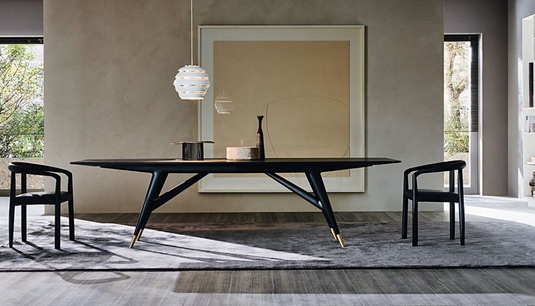 The D.859.1 Gio Ponti dining table, designed primarily as a meeting table for up to ten people, has an impressive size of over 3,60-metres long and a refined design. The legs are notable for their fine membered modernity, creating a trapezoidal single-span bridge upon which the large tapered top conveys the idea of aerodynamics. Originally made of solid ash with bronze ferrules, it is now also available in a darker-toned wood such as black stained ash. In addition to its original dimensions, the D.859.1 is available in two smaller versions that faithfully reproduce the harmony and proportions of the original design.