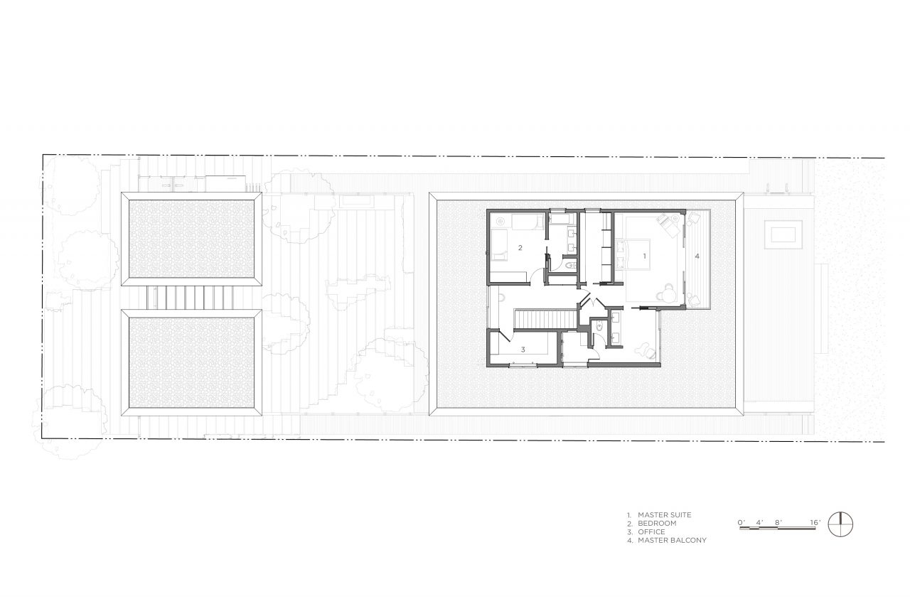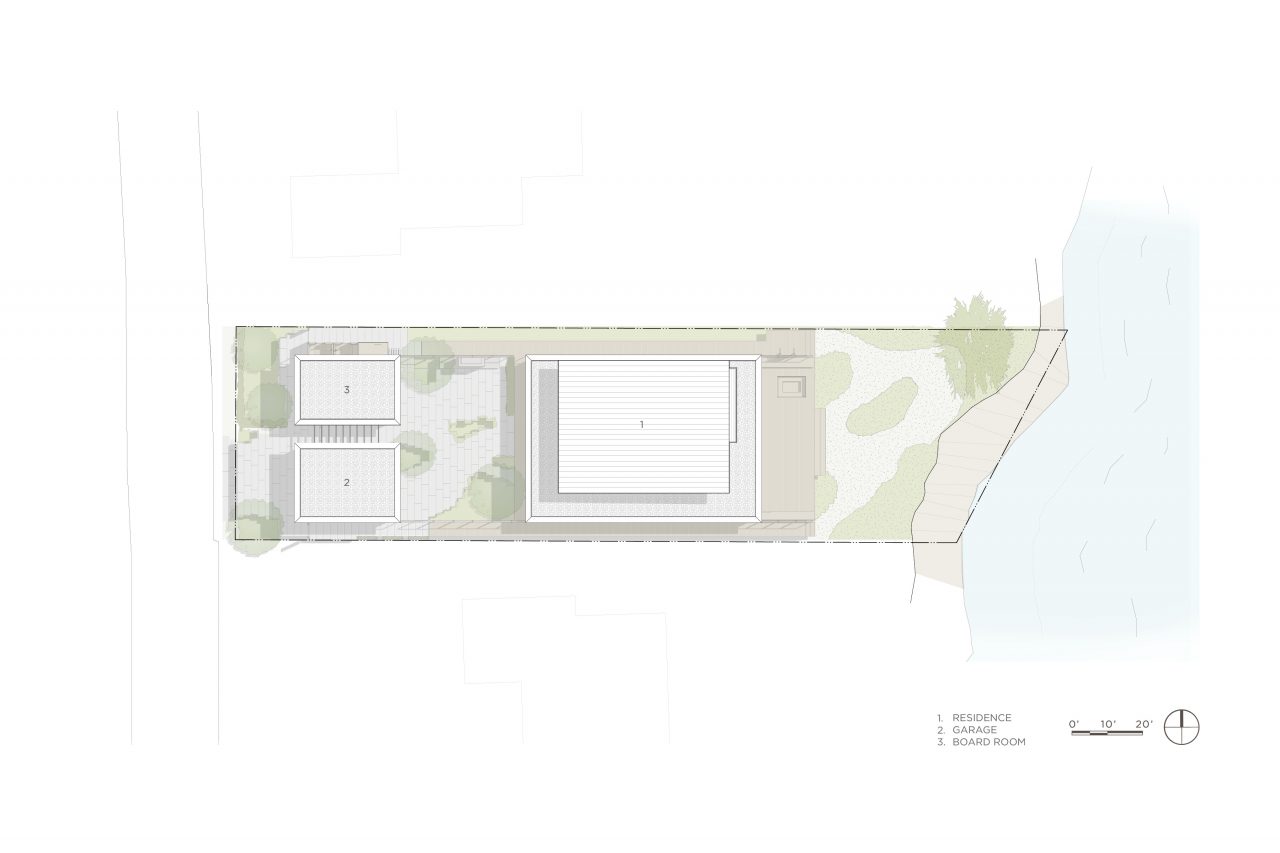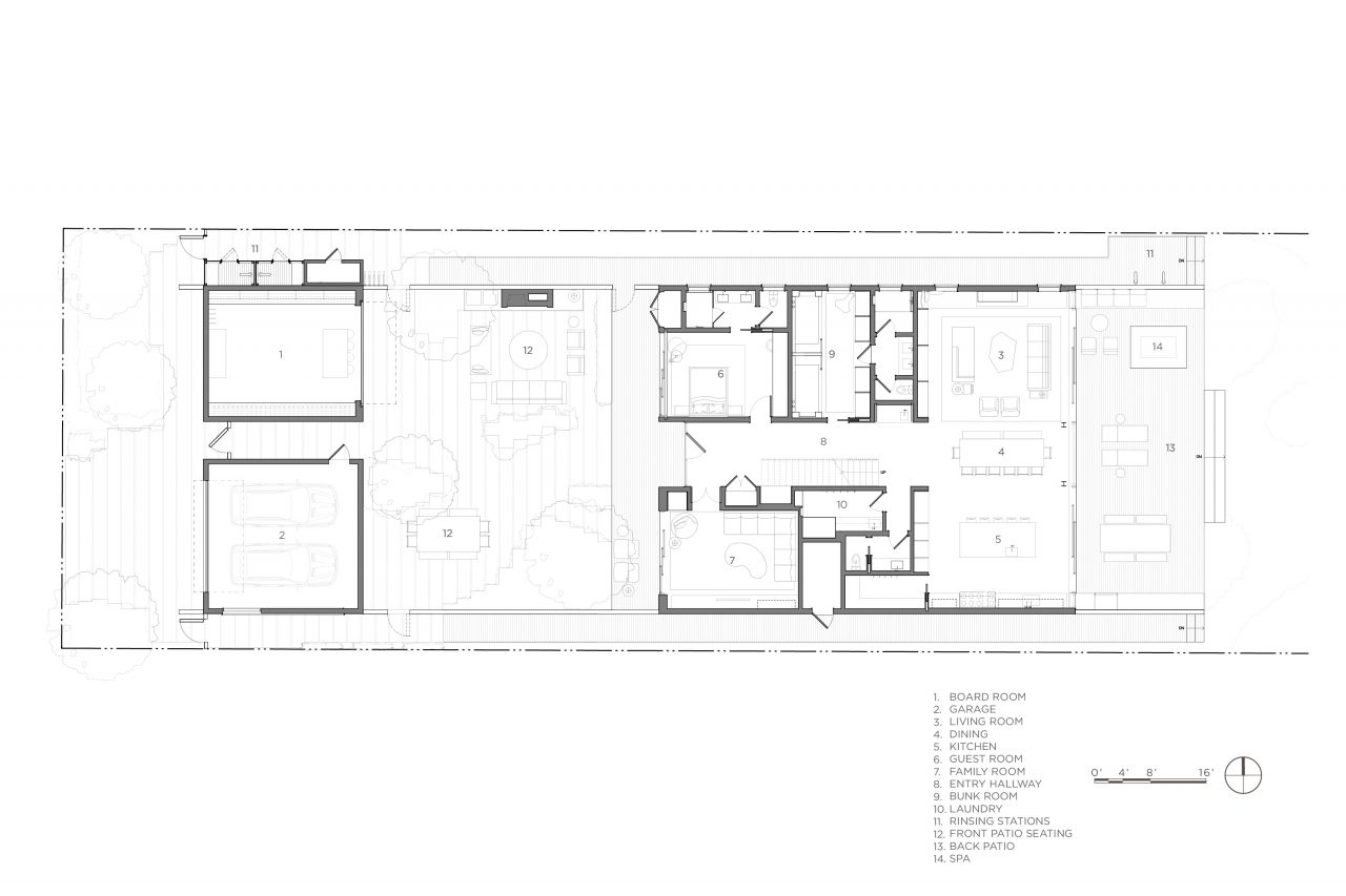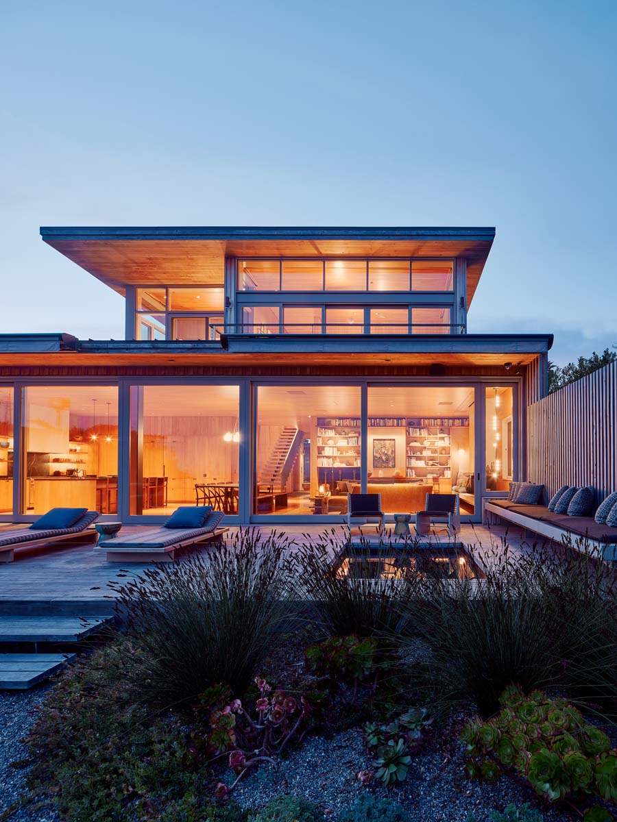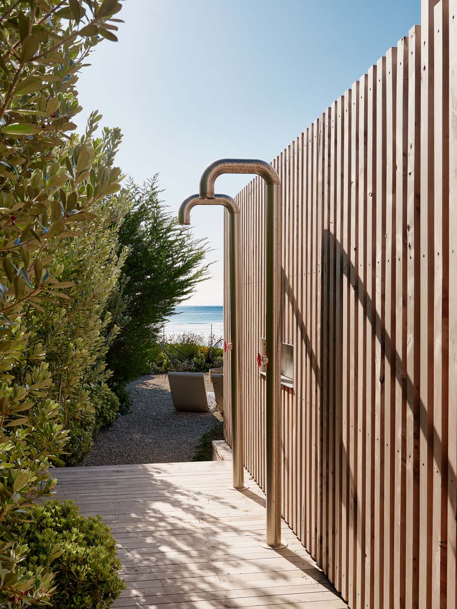 Subject to a 100-year geologic setback requirement and the CA Coastal Commission, a site-sensitive solution that respected both the coast and the community became a design focus. The home is sited as a wind break: the rear yard and deck capitalise on ocean views, while the entry and front courtyard, tucked behind two separate structures (a customised surfboard storage unit and garage), sit where the sun shines most in the winter, acting as a warm, light-filled cloister all year round, protected from the coastal winds.