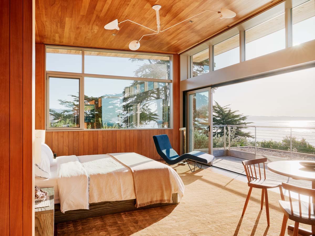 Upstairs, as the home transitions from public to private, Monterey cypress dissolves into plaster, diversifying the palette and drawing attention to carefully designed architectural details. Thoughtfully placed windows weave surprising glimpses of blues and greens into the earth-toned interior finishes. The master bedroom features floor to ceiling glass walls facing the waves, opening onto a private balcony with views of surfers below.
