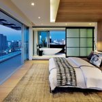 - The main bedroom enjoys panoramic views. Matt black bathroom fittings are by Meir, Australia and are imported by Flush Bathrooms.