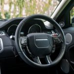 The colour palette of our review vehicle is influenced by one of London’s most iconic post codes and has global connotations in its detailing. The Evoque SW1 Monochrome Special Edition is finished in Corris Grey, with a Santorini black roof, while Fuji White British Union Flag graphics on the spoiler and door mirrors add finishing touches. Treadplates are etched with the same iconic flag logo and doormats follow suit with white graphics. Anodised red detailing highlights the automatic rotary shift and paddle shifts.
