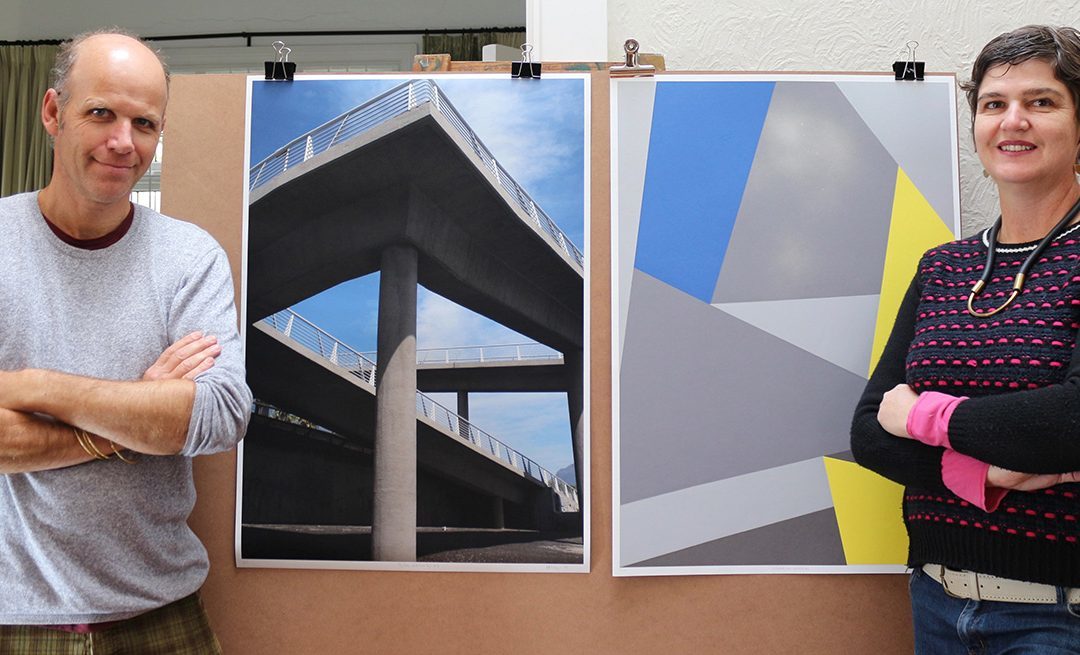 Stewart (a collage artist) and Suter (a photographer) are presenting a collaborative project for the Biennial. The work entitled “Fly-overs and Drive-bys” incorporates images taken of the everyday functional but overlooked spaces around Cape Town, South Africa that carry both foot and vehicular commuters to and from their places of work, worship and home. These images have a sense of infinity and seem to ask the audience: “Where is this going, and is this how we get there?” There is a surprising grace and harmony the artists see in the use of harsh concrete forms, places of function and unexpected beauty amidst the non-stop roar of traffic noise.