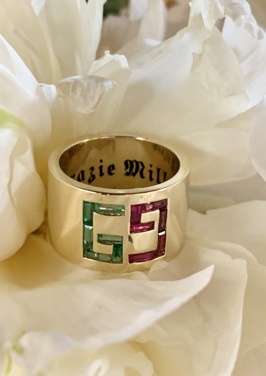 above: This bespoke ring from the Memorandum collection says YAY LOVE and is engraved with a quote from the Dalai Lama XIV: ‘Choose to be optimistic, it feels better.’ Material: 18kt yellow gold with 32 diamond baguettes.