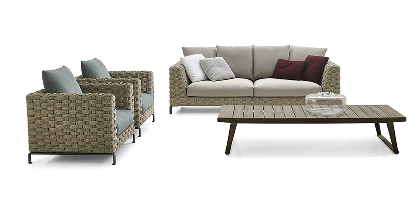 Ray Outdoor Natural features a ‘rope’ weave inspired by natural Manila hemp and designed to merge with nature. It uses a textilene fibre designed for outdoor use. Ray Outdoor Fabric features a ‘ribbon’ weave technique made of polypropylene fibre that is resistant to both UV radiation and atmospheric agents. The range includes sofas available in two depths as well as modular elements such as terminal pieces, chaise longues, armchairs and a sunbed. The colour range features turquoise to blue, or acid green to Tortora and a bright Bordeaux.