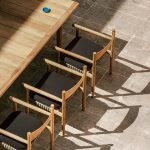 The TIBBO chairs are distinguished by round arms and legs and the sail-like three- dimensional curve of its thin, formed seat back. “The beauty of turned wooden has a tactile quality like no other material,” the designers explain. “Because of the oily nature of teak, the wood feels especially soft, and so we set out make furniture that would accentuate these properties.”